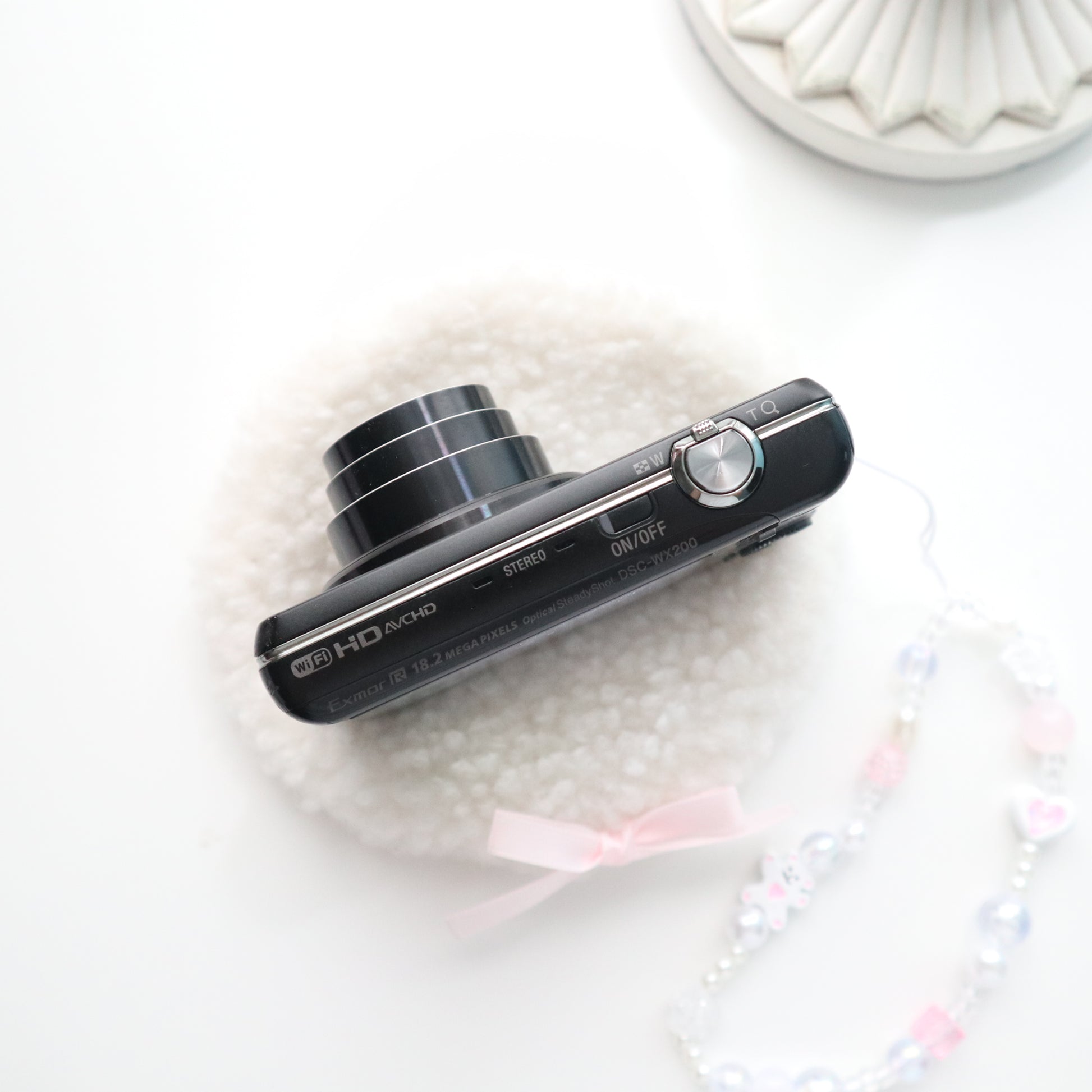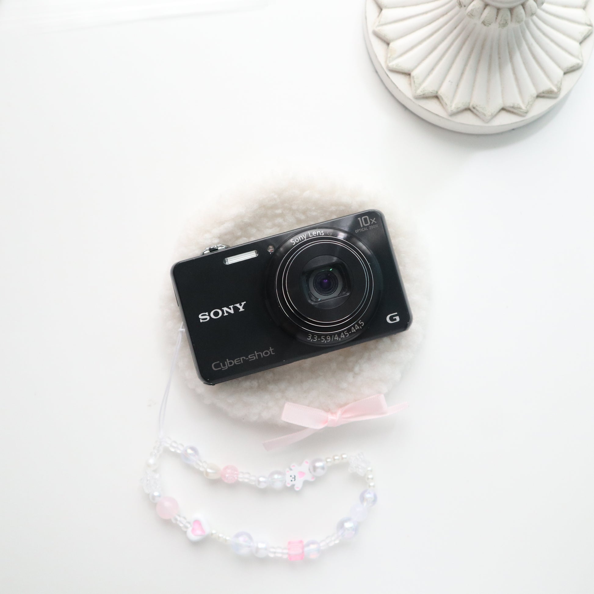 ⤿ camera, battery, charger, premium beaded strap, cute camera pouch, cleaning cloth, freebies, SD CARD